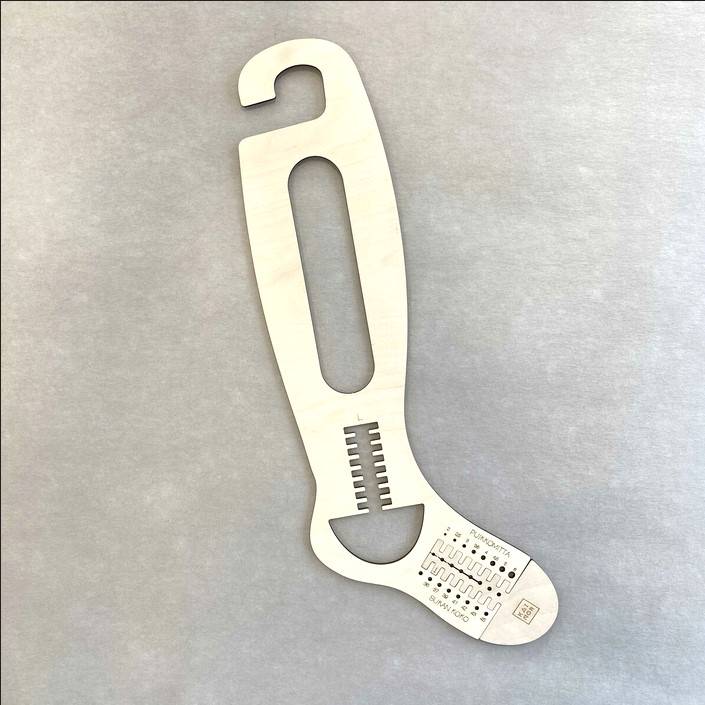 kokoon välillä 36 - 45. L-kokoisessa plokissa reiden paksuus on 13,3 cm (pohkeen ympärys 37-45cm). Sukkaplokki on laserleikattu suomalaisesta