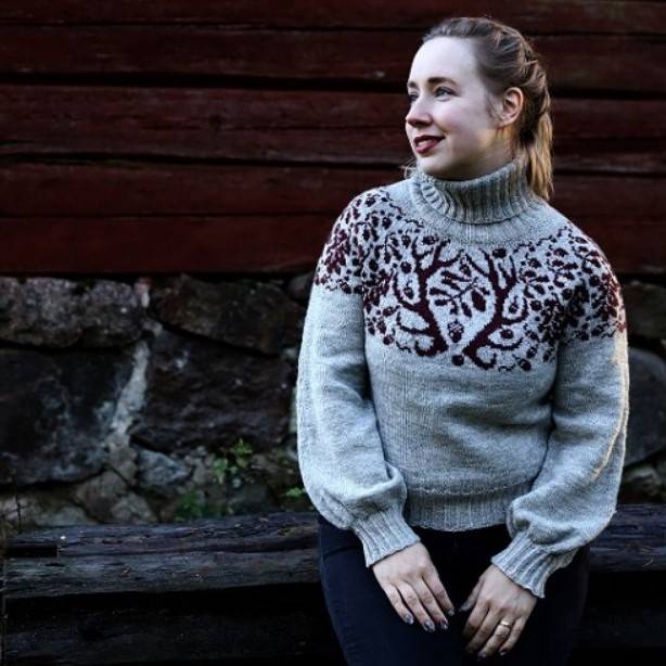 Acorns and Antlers on suloinen pusero, joka neulotaan saumattomasti ylhäältä alaspäin. Puserossa on pyöreä kaarroke, jota koristaa syksyinen kirjoneulekuvio putoilevine lehtineen, tammenterhoinen ja marjoineen. Puseron katseenvangitsija on keskellä edessä olevat näyttävät peuran sarvet. Neulominen aloitetaan korkeasta poolokauluksesta, jonka jälkeen muotoillaan niska korkeammaksi lyhennetyin kerroksin. Mallissa on pitkät ja väljät piispanhihat. Helma on lyhyt ja mukana on ohjeet vapaavalintaiseen rinnan muotolaskokseen.