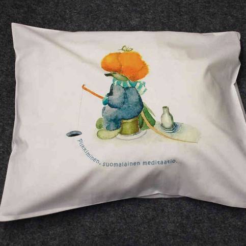 Tyynyliinassa teksti: Pilkkiminen, suomalainen meditaatio.
