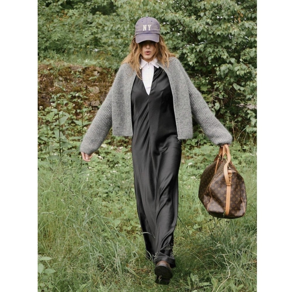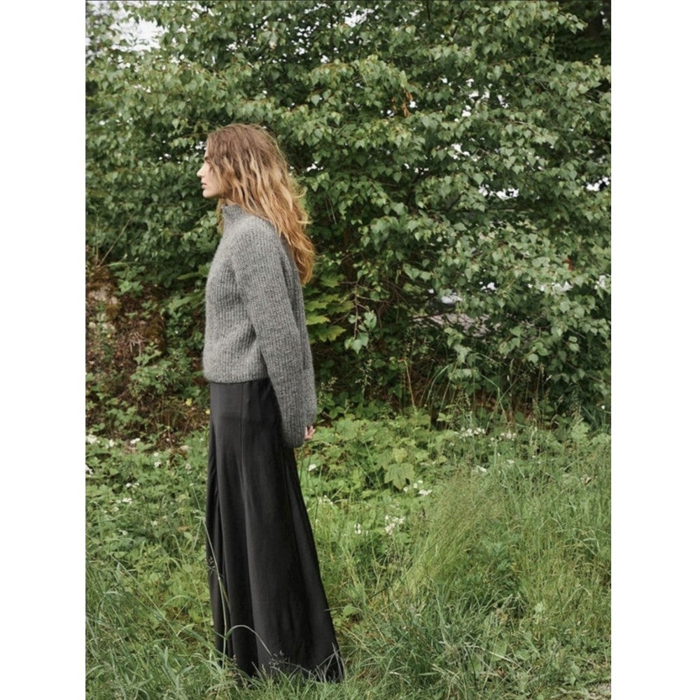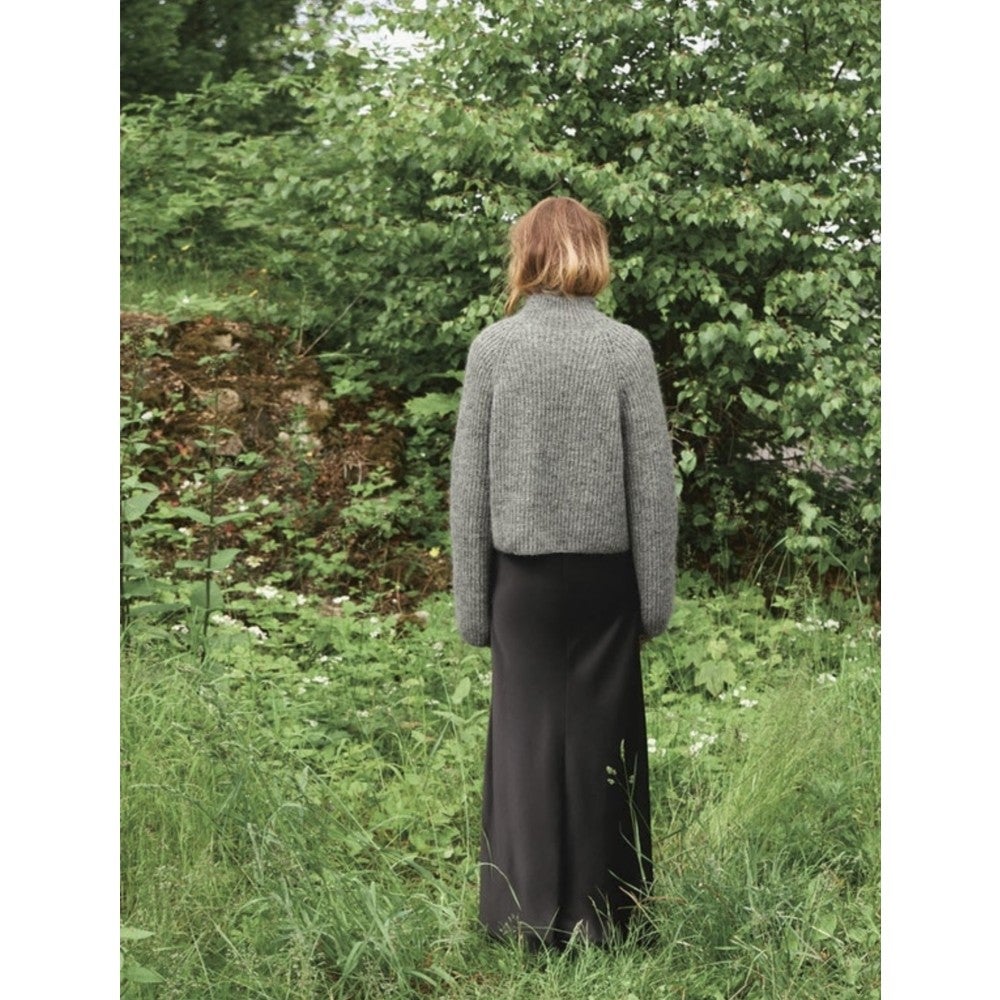 Langan menekki: Sunday, meleerattu harmaa 1042: (300)300(350)400(400)450(500)550(600) g ja Tynn Silk Mohair, tumma meleerattu harmaa 1053: (175)175(200)225(225)250(275)300(325) g.