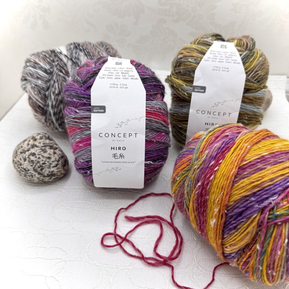 Katia Hiro toimii kauniisti yhdessä silkkimohairlangan kanssa esim. Sandnes Garn Tynn Silk Mohair tai Knitting for Olive Soft Silk Mohair, tuoden neuleeseen lisää pehmeyttä ja ilmavuutta. Se sopii myös yksivärisen langan rinnalle, jolloin monivärinen pinta saa rauhallisen kontrastin ja neuleeseen syntyy kiinnostava rytmi.