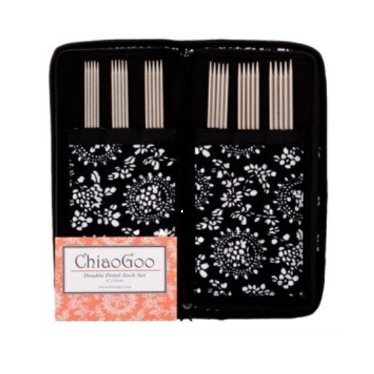 Valikoima ChiaoGoon laadukkaita 15 cm pitkiä sukkapuikkoja sekä tarvikkeita pakattuna kauniiseen, vetoketjulliseen säilytyskoteloon. Keveät ja kestävät puikot ovat ruostumatonta kirurginterästä, jonka satiniinsileäksi viimeistellyllä pinnalla lanka liukuu vaivatta. Puikon koko on pysyvästi laserkaiverrettu puikkoon.